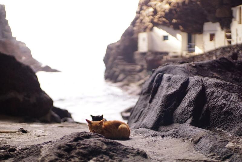 Nous empruntons ensuite le chemin de pierres qui continue à descendre toujours plus bas pour finalement arriver à notre destination. Le village est vraiment étonnant et ne contient que quelques maisons construites, un peu les unes sur les autres, à même la roche. L’océan est transparent et les vagues s’engouffrent et repartent de cette grotte, au pied des maisons. Il n’y a pas un chat, sauf trois petits chats et nous avons tout le loisir de nous balader entre les maisons de ce tout petit village. Nous comprenons vraiment pourquoi les habitants viennent ici pour passer leur weekend 😊