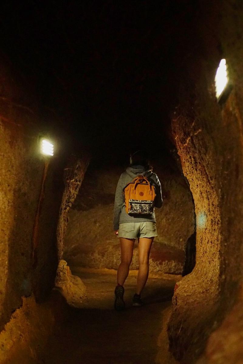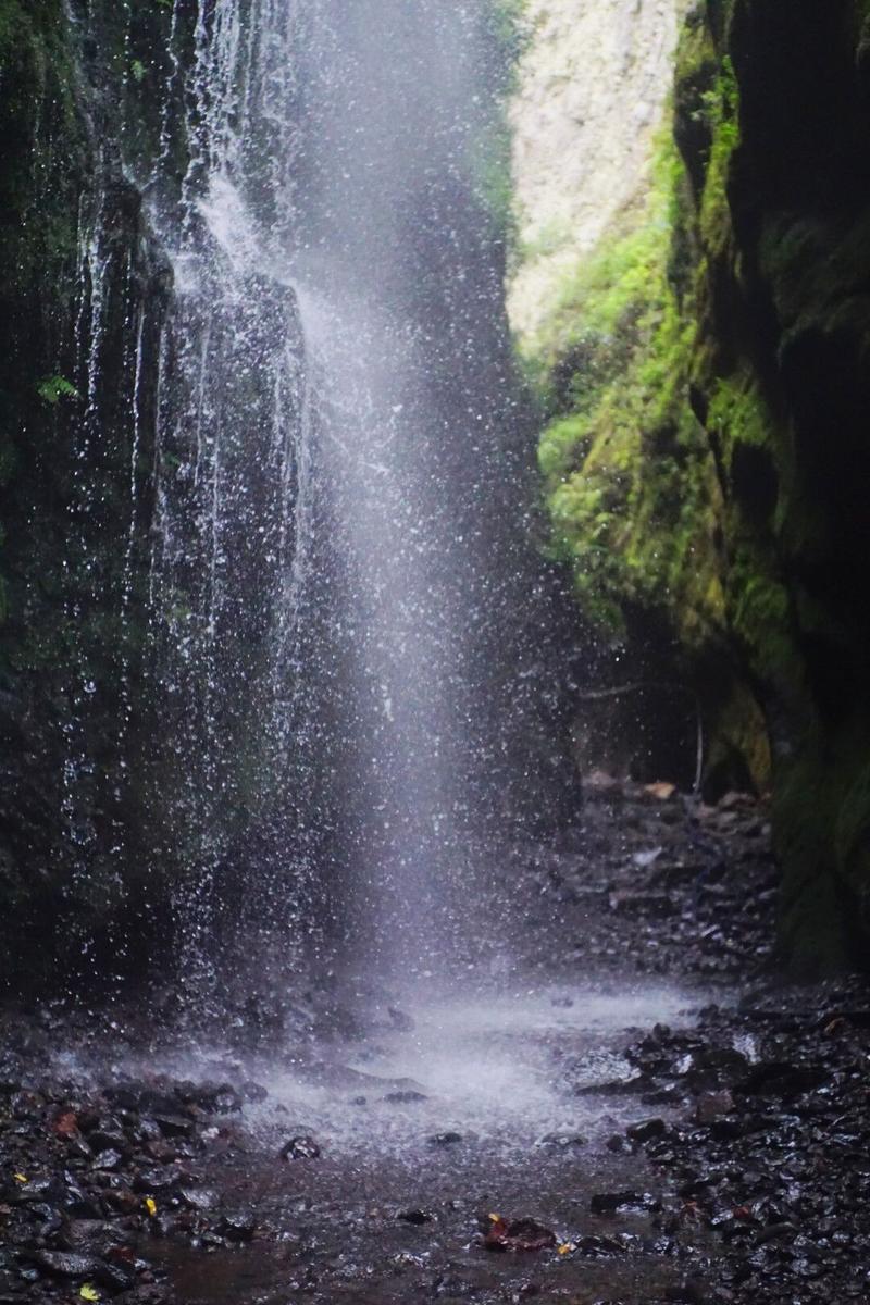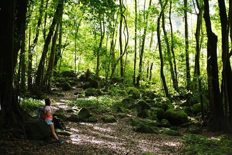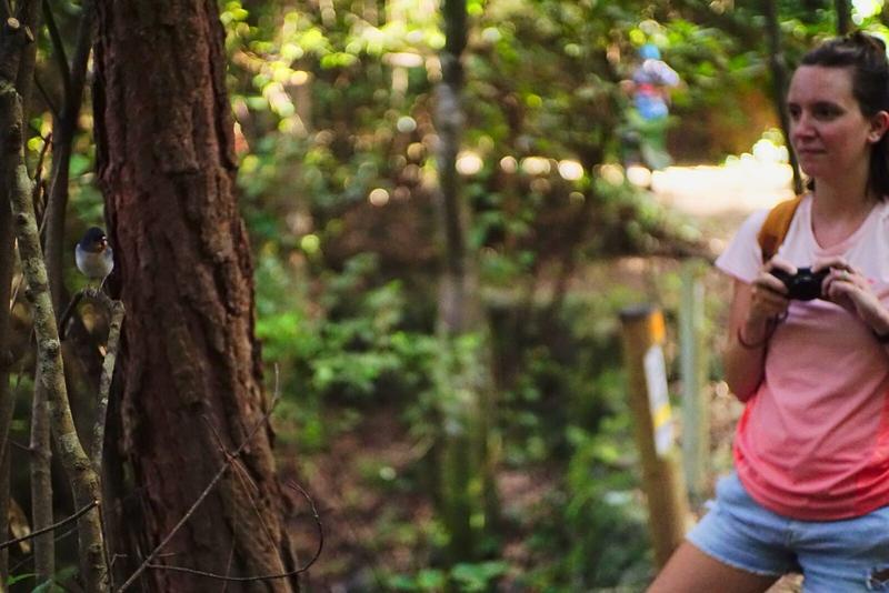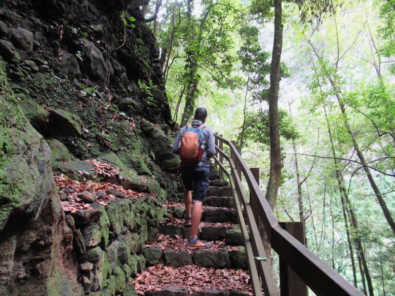 Après un rapide repas sur le bord de la route (ambiance roadtrip comme on l’aime 😉), nous commençons donc par nous rendre au centre des visiteurs de la forêt et déjà là on a l’impression d’être dans une jungle au fin fond de nulle part. D’ailleurs, nous avons quitté d’un coup le soleil qui nous accompagnait sur la route jusque-là pour arriver sous un ciel plus nuageux. De là, un sentier mène à une cascade et ce sera notre premier objectif. Ce court sentier s’enfonce sous la roche à travers un tunnel construit spécialement pour y arriver. Ce chemin est plus fréquenté que les derniers que nous avons empruntés mais il débouche rapidement sur ce qui ressemble au lit d’une ancienne rivière, coincé entre deux falaises verdoyantes. L’endroit est vraiment magnifique et la cascade est très accessible. Coup de chance, nous restons seuls à profiter des lieux un petit moment 😊