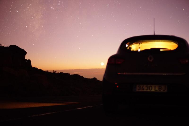 Après cette randonnée, nous redescendons un peu plus bas et sortons de la zone des télescopes géants pour continuer un peu plus loin et voir la vue vers un autre bout de l’île. Nous faisons une autre randonnée vers un autre point culminant de l’île, le Pico de la Cruz, à 2351m d’altitude. Le soleil commence à se coucher doucement, il est temps pour nous de trouver notre spot pour l’observation des étoiles. Nous devons redescendre un petit peu et quitter la zone des télescopes car elle ferme la nuit tombée, pour éviter la pollution lumineuse émise par les phares.
