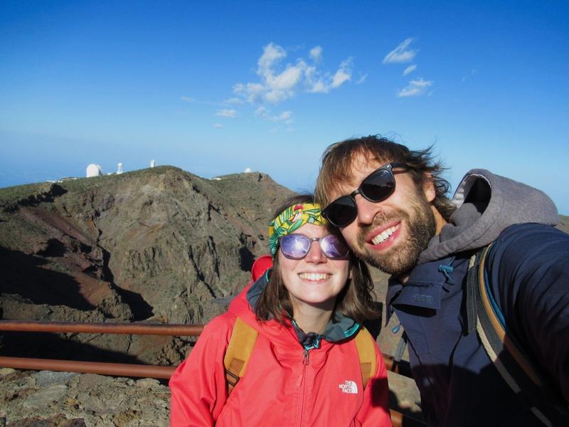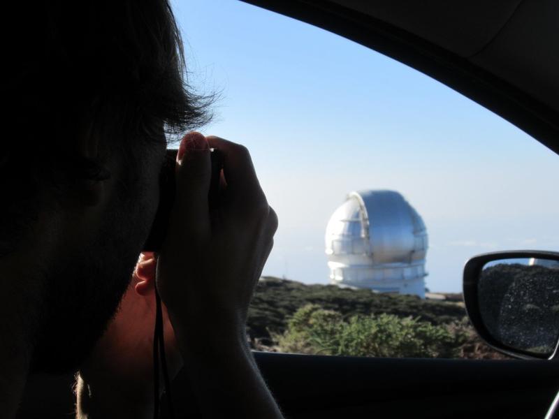 Aujourd’hui, le temps est à nouveau superbe et le ciel bien dégagé. Nous décidons de profiter de cette journée pour partir à la chasse aux étoiles. La Palma est l’un des meilleurs endroits au monde pour l’observation du ciel, car elle possède une réserve Starlight. C’est un peu comme une réserve naturelle, où l’on protège alors la faune et la flore, mais ici tournée vers le ciel et les étoiles : de nombreuses mesures sont mises en place pour rendre optimale leur observation. Ainsi, aucun avion n’est autorisé à survoler l’île, la nuit tombée ; les éclairages publics sont faibles et orientés vers le sol pour ne créer aucune pollution lumineuse et La Palma possède un point de vue à très haute altitude qui rend cette observation encore plus efficace : Le Roque de Los Muchachos. C’est vers cette destination que nous nous mettons en route, le chemin pour y arriver est relativement long et ça grimpe pas mal 😊 Après une bonne heure trente de route, nous arrivons au point le plus haut de La Palma à 2426m d’altitude, et la vue est à couper le souffle. Nous avons vu les villes s’éloigner petit à petit au fur et à mesure que nous grimpions, nous avons passé la couche nuageuse, et nous avons continué sur cette route jusqu’à arriver dans cette zone qui est remplie d’observatoires astronomiques dédiés à des pays précis.