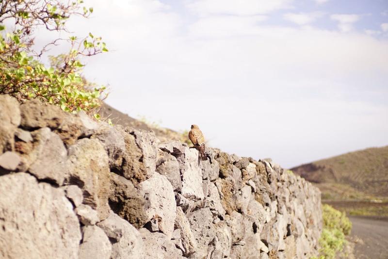Le soleil cogne fort mais nous nous mettons en route pour trouver le début de notre petite randonnée sur le volcan Teneguía. Nous trouvons le point de départ et garons la voiture sur le bord de la route, ou plutôt sur le bord de la falaise (en marche arrière, toujours bien rassurant 😊). Et nous voici partis pour une balade sur ce sentier fait de roches noires. La vue est plongeante, belle et impressionnante tout le long de la balade. Un petit faucon nous accompagne sur un court tronçon et reste assez proche de nous.