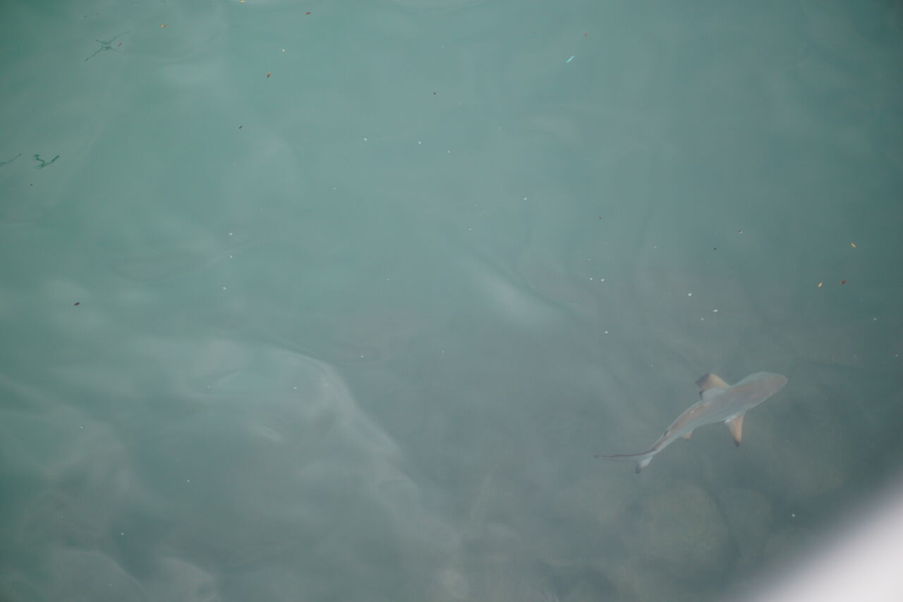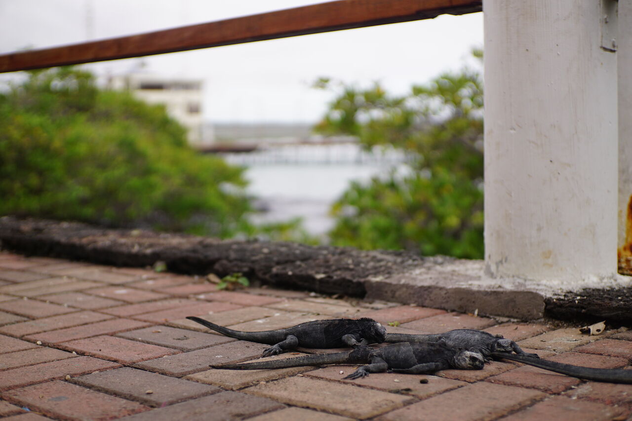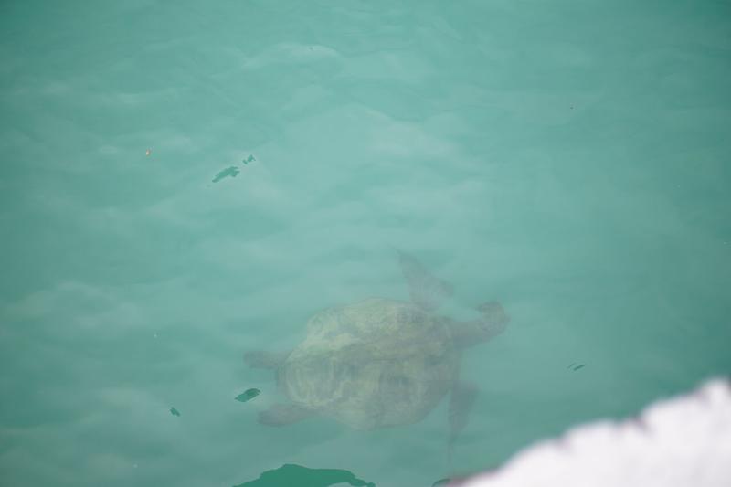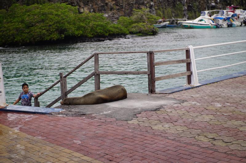 Après avoir mangé, on se balade sur la petite jetée, on voit encore un nombre impressionnant d’iguanes et de crabes… et on tombe nez à nez avec des otaries qui sont affalées sur et autour des bancs. On est hallucinés, elles sont juste là tranquillement à se reposer au milieu des locaux qui s’amusent à faire des plongeons dans l’eau, de quelques touristes qui passent autour en faisant des photos… C’est fou ! On revient vers le petit embarcadère du port et on baisse les yeux vers l’eau où on voit rapidement de nombreux poissons, puis des bébés requins à pointe noire qui tournoient au milieu d’eux. Un, deux, puis cinq requins, facilement observables depuis le ponton, on est émerveillés. Une tortue marine remonte à la surface pour respirer juste devant nous, puis une seconde…