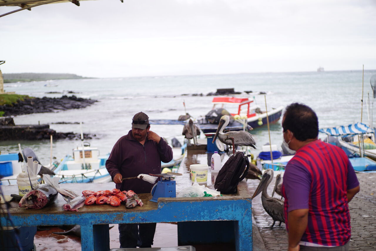 On n’en revient pas de tout ce qu’on a déjà pu observer en deux heures, sans même mettre la tête sous l’eau. On parcourt le malécon (rue qui longe l’océan) et ses nombreux restaurants et bars surtout destinés aux quelques touristes présents et on tombe sur un comptoir de poissonnier où sont vendus d’énormes thons. Autour d’eux, les pélicans et quelques otaries se pressent dans un grand bruit, en espérant pouvoir chopper un petit morceau.