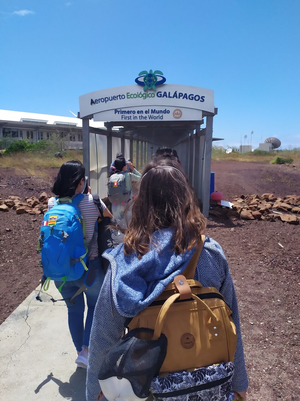 On atterrit sur l’île de Baltra, déjà complètement émerveillés par tout ce que nous voyons. Ces iles n’étaient pas prévues au programme de notre tour du monde, mais c’est le genre de surprises que le COVID nous réserve et c’est plus que sympa ! On descend sur le tarmac puis on marche sous le signe de l’aéroport des Galápagos, trop classe. On passe sous un nouveau jet désinfectant et on se met dans la file pour passer le contrôle d’immigration.