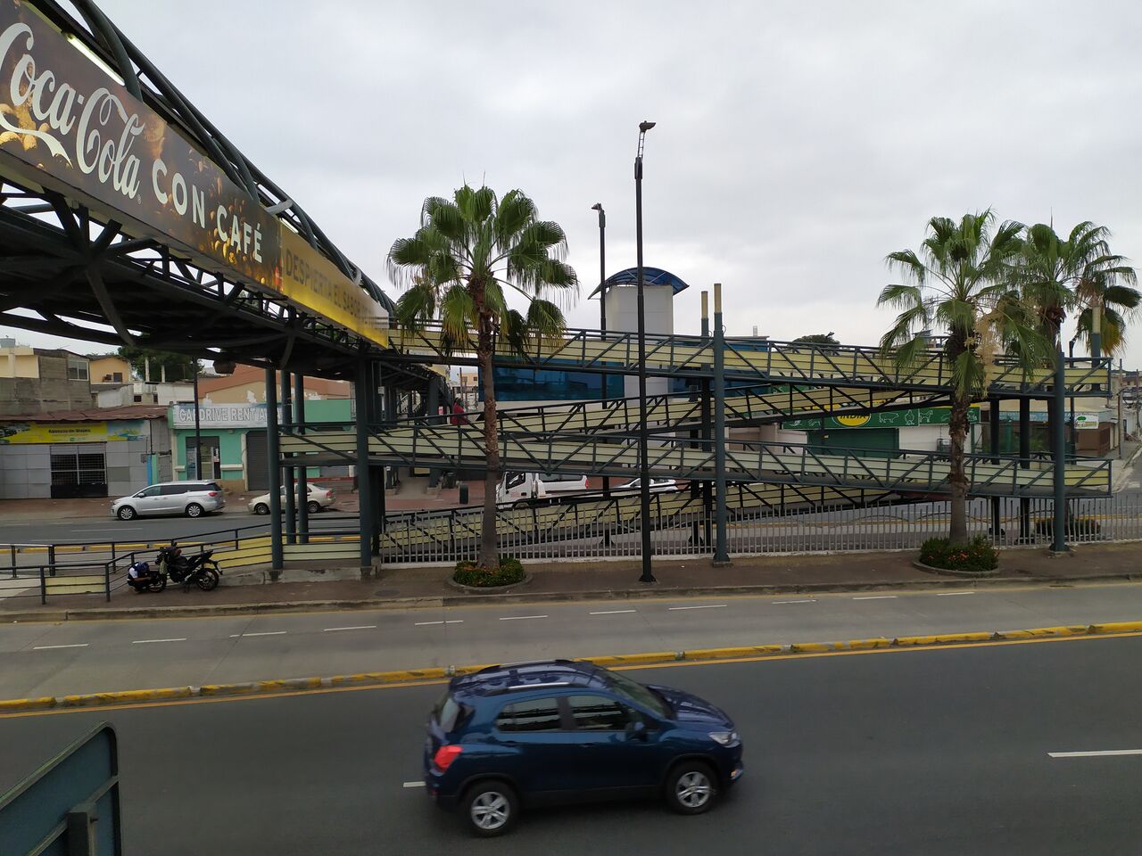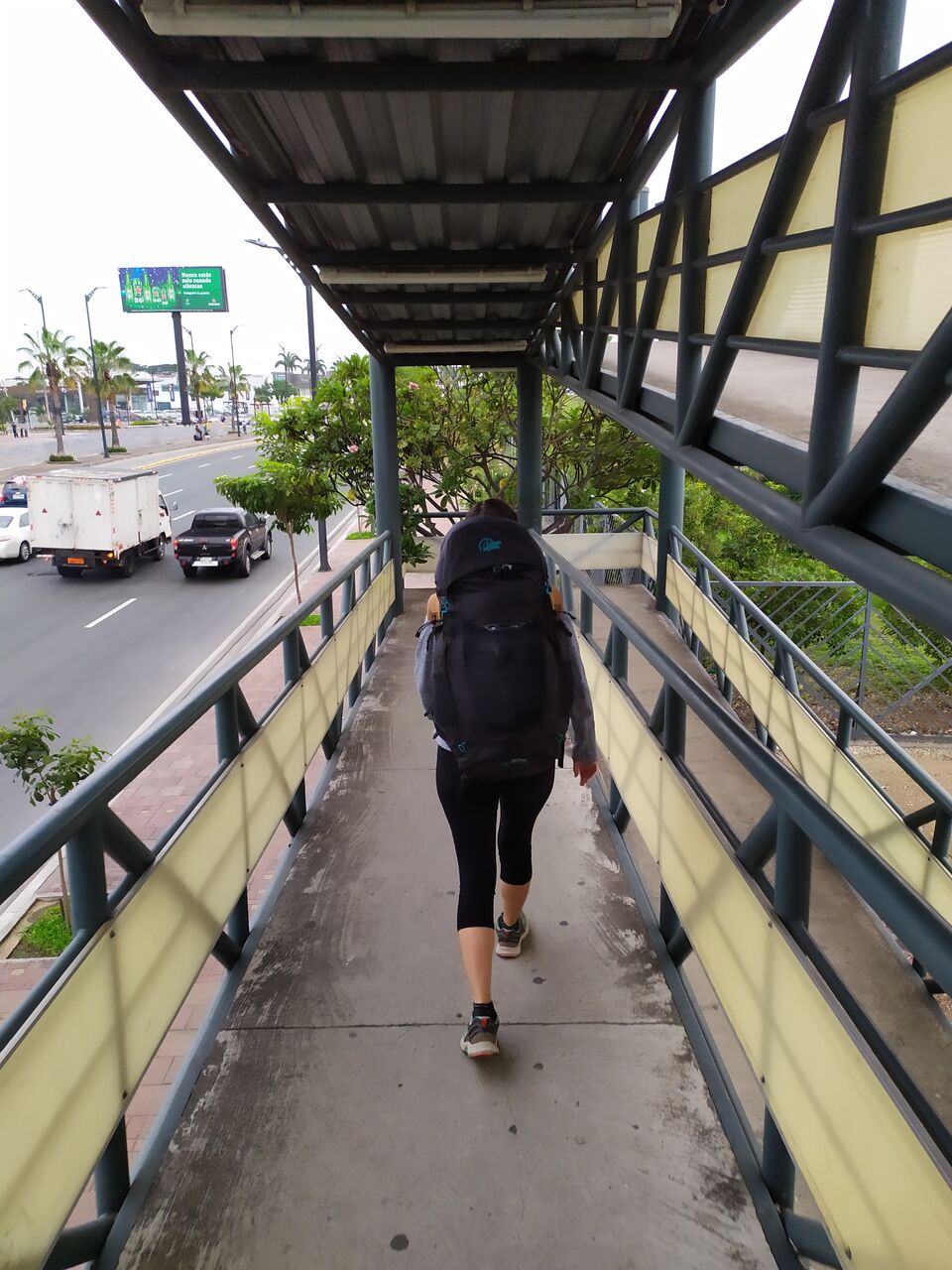 On sort de l’aéroport puis on marche jusqu’à l’hôtel, il fait très chaud ! On avait un peu peur d’avoir un choc thermique en arrivant du Mexique mais il n’a pas lieu, on transpire bien ici aussi 😊 Heureusement, l’hôtel n’est vraiment pas loin à pied car d’énormes passerelles permettent de traverser un gros axe routier. Les rues sont plutôt vides, l’état d’urgence sanitaire a été déclaré dans plusieurs régions du pays et un confinement est imposé du vendredi soir au lundi matin… Nous sommes dimanche. On passe devant une banque mais on se dit qu’on pourra y aller le lendemain matin. Changement de pays, changement de monnaie… On revient aux dollars américains ! Et oui, l’Équateur s’est dollarisé il y a quelques années.