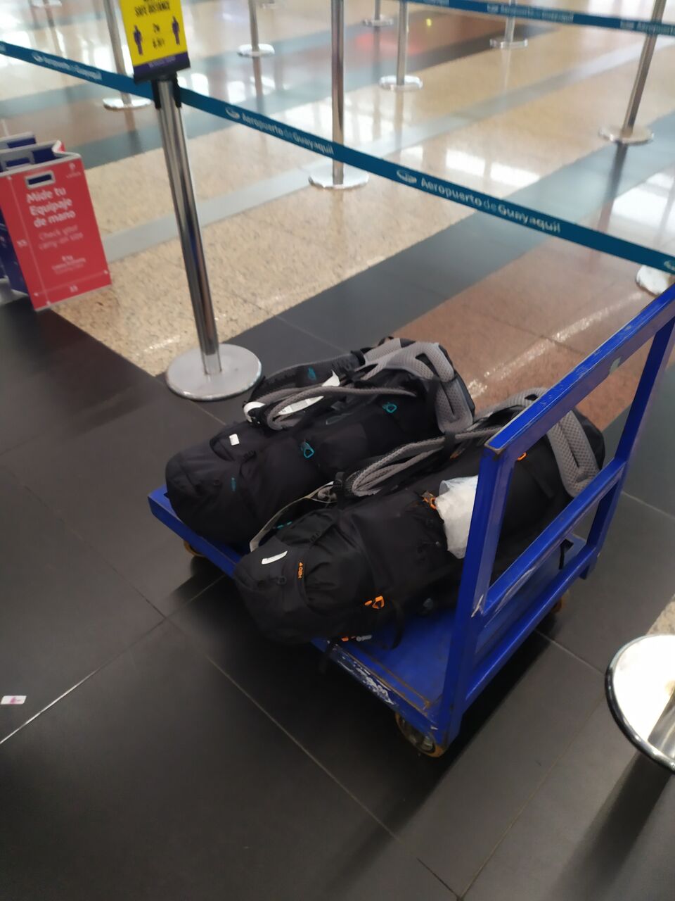 On se réveille pour la première fois en Équateur, on a un peu de mal à réaliser… surtout qu’il est tôt car nous devons être à l’aéroport vers 7h30. On quitte l’hôtel en réveillant le responsable car tout est fermé, puis on marche jusqu’à l’aéroport. On retourne au distributeur de billets qu’on a trouvé hier puis nous allons vers l’entrée de l’aéroport, un peu stressé : on espère qu’on a bien tous les documents et que tout est bon.