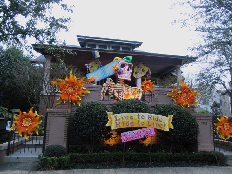 On continue notre tour de la ville en rejoignant Magazine Street, longue rue qui part du French Quarter vers le parc Audubon en traversant les quartiers de Central Busniess District et ses hauts buildings, le Faubourg Lafayette et Garden District et leurs belles maisons. Dans cette rue, on perçoit directement une ambiance carnavalesque plus forte, les bâtiments sont beaucoup plus décorés. Ainsi privée de son carnaval cette année, La Nouvelle-Orléans a dû se réinventer : ce sont les maisons qui bénéficient des décorations traditionnellement réservées aux chars (Krewe of House Floats). Pas de défilé, ni de rassemblement dans les rues mais ce sont les gens qui défilent devant les maisons pour venir les admirer. Une belle manière de garder l’esprit festif tout en restant safe ! L’idée soutient aussi toutes les personnes et les collectifs d’artistes qui travaillent souvent plusieurs mois à la préparation de cet événement.