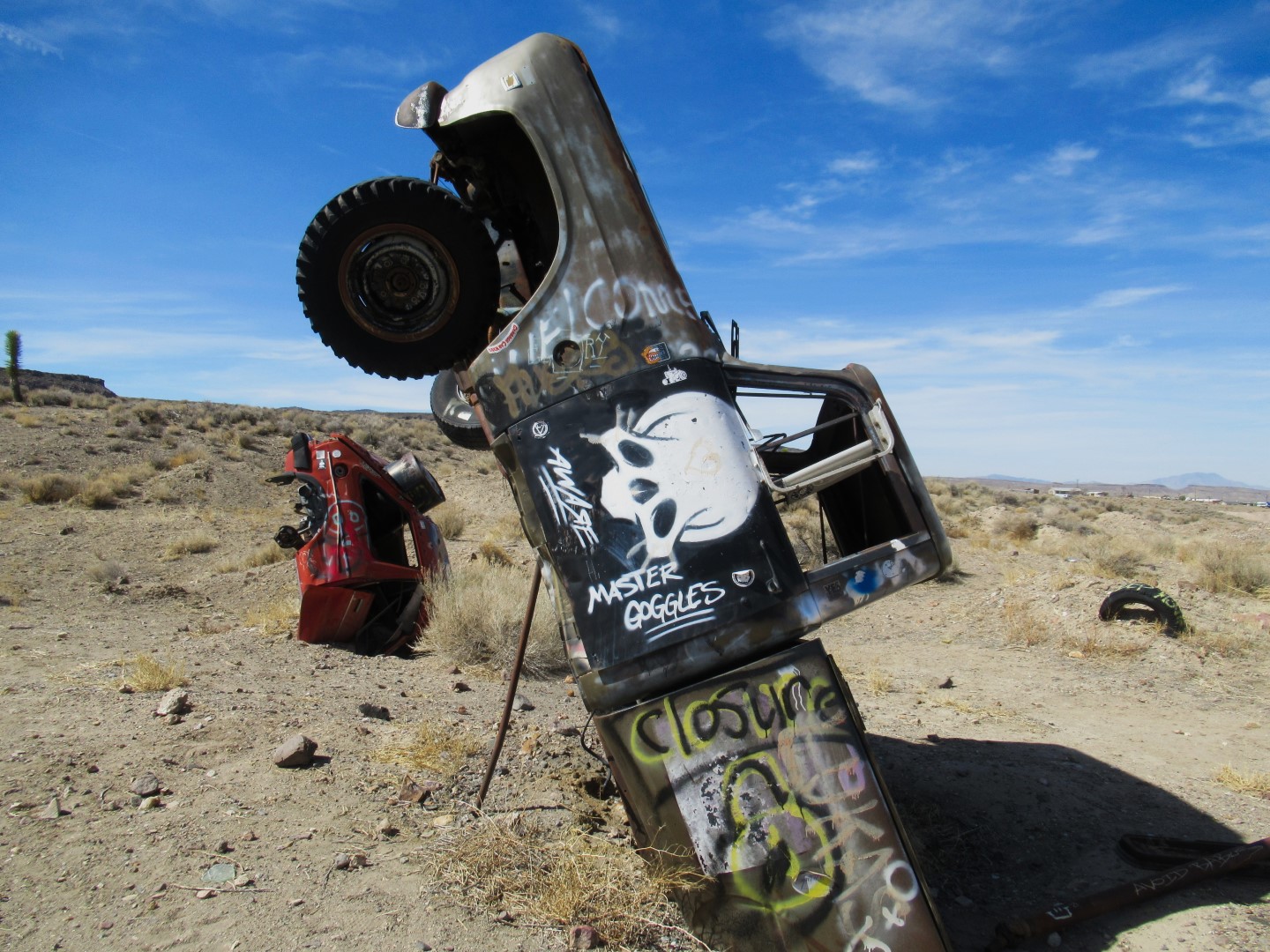 On arrive ensuite du côté de la petite ville de Goldfield qui est une roadside attraction en elle-même, remplie de roadside attractions, bref une petite pépite… d’or ! On passe par la Yellow Road, qui semble avoir servi de test pour les traceurs de signalisation, avant d’arriver à la International Car Forest Of The Last Church. Cette petite partie de désert est remplie de carcasses de voitures plantées dans le sol et peintes, les transformant en œuvres d’art. Il y a même de longs bus qui semblent tenir en équilibre précaire, impressionnant ! En plus, on a eu l’endroit pour nous seuls, loin de la foule qu’on avait eue du côté de Cadillac Ranch. L’endroit est bien plus grand, un sacré coup de cœur !