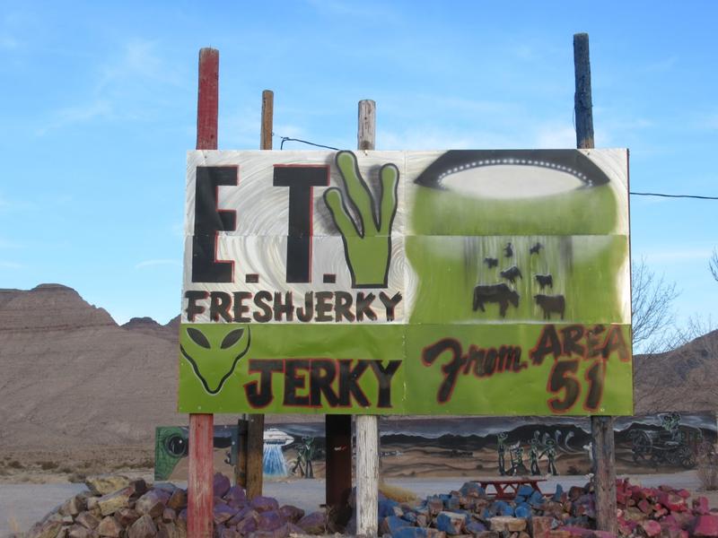 On fait le plein avant de repartir car il n’y a plus de pompe à essence sur des miles : nous rentrons sur la Nevada State Route 375, plus connue sous le nom de Extraterrestrial Highway ! Et ce nom s’explique facilement car nous sommes tout proche de l’Area 51 ! Nous avons bien cherché, nous avons bien regardé partout mais toujours pas de petit bonhomme vert à l’horizon ! Par contre, nous y avons croisé des vaches en liberté, les mêmes que les Martiens aiment bien enlever dans les films ! Un rapide passage par le café/bar/motel A’le’Inn (une gommette pour le nom), puis nous passons à côté de la rue qui doit normalement mener à l’un des barrages marquant le début de la zone 51. Nous n’avons pas osé pousser la curiosité jusque-là, c’est quand même fortement déconseillé 😉