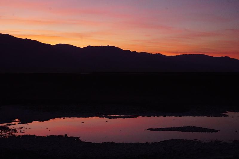 On continue ensuite la route en direction de Badwater, juste en contrebas (mais près d’une heure de route quand même) où nous nous arrêtons pour marcher sur cette partie blanche et salée de la vallée. Le soleil se couche petit à petit derrière la montagne, pendant que nous avançons. Nous arrivons à un endroit où le sol salé crée des formes géométriques, c’est vraiment magnifique. Nous faisons demi-tour et retournons vers la voiture, les chauves-souris sont de plus en plus nombreuses pour attraper les insectes qui sortent à cette heure.