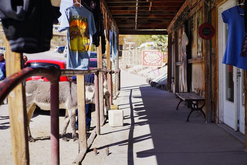 On continue notre route, qui zigzague au milieu des montagnes et qui s’élève pour nous offrir des points de vue assez incroyables. Elle nous mène jusqu’à la petite ville d’Oatman, encore plus perdue au milieu du désert. Ca fait quelques miles que des panneaux avertissent qu’il peut y avoir des mules sur la route et on voit les traces de leur passage. 💩 On se gare et on voit effectivement une mule qui traine autour du parking ! Cette petite ville est connue pour ses mules sauvages, descendantes des mules amenées par les chercheurs d’or qui ont fait la réputation de la région. On entend une énorme déflagration et on voit un attroupement de personnes… C’est un gun show à l’ancienne au milieu de la rue principale ! On s’approche et on regarde le spectacle, en se saisissant à chaque coup de feu. La ville est super sympa, assez touristique mais on se croirait vraiment dans un décor de film de Far West. Les bâtiments sont très bien entretenus, il y a des mules partout (elles ne sont pas bêtes, il est possible d’acheter de la nourriture pour elles dans tous les petits magasins), et tout est là pour plonger les touristes dans l’ambiance : les saloons (dont l’un d’eux a les murs recouverts de billets d’un dollar), une ancienne mine, une ancienne prison, et tout ça dans un paysage magnifique. On voit même un roadrunner (bip-bip) passer ! Un arrêt vraiment trop cool qui valait le détour !