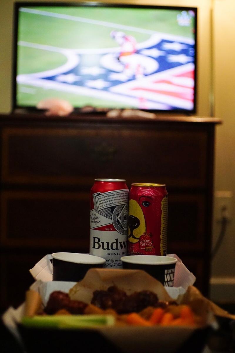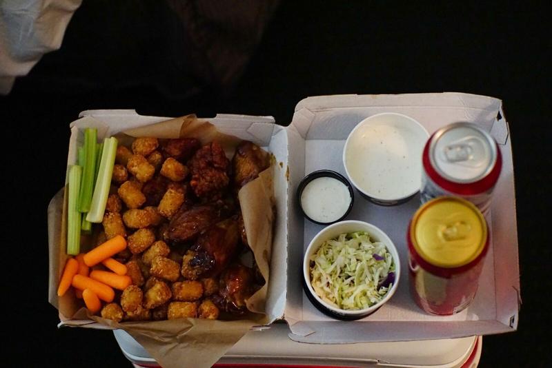 Autre partie intégrante de la culture américaine : ce soir c’est le Big Game, l’événement sportif le plus important et le plus attendu de l’année ici – plus connu sous le nom de Super Bowl. On est contents de pouvoir le vivre en live aux États-Unis et on s’y prépare au mieux : on va chercher des chicken wings chez Buffalo Wild Wings (mix de classic wings, boneless wings et tots – accompagnées de baby carottes et céleri avec une sauce ranch). Pas de doute, on est au bon endroit, la file est longue et on était évidemment les seuls à n’avoir pas réservé, mais vu notre petite commande, ils l’ont prise quand même. On regarde le début du show et le coup d’envoi sur l’une des nombreuses TV du restaurant en attendant nos wings.