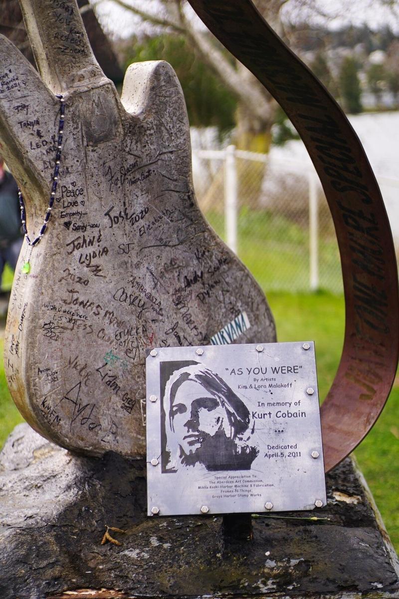 On reprend ensuite la route vers la petite ville d’Aberdeen, déjà notre dernière étape dans l’état de Washington. Cette ville assez petite et pas forcément très jolie est celle qui a vu naître Kurt Cobain, le chanteur de Nirvana. La ville arbore d’ailleurs la phrase « Come as you are » sur son panneau d’entrée. Un petit parc commémoratif est dédié au chanteur et rassemble des statues, une fausse tombe, un air guitar (comprendre qu’il n’y pas de guitare, mais juste un pose-guitare 😉), de nombreux tags…