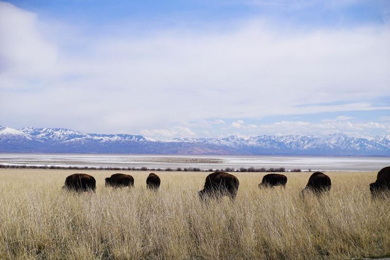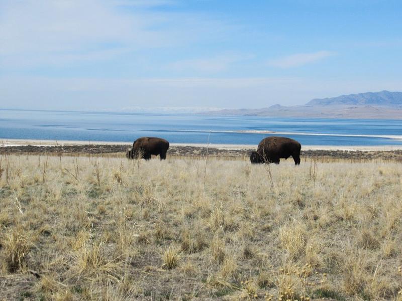 On quitte ensuite l’hôtel, en direction d’Antelope Island State Park, une petite excroissance de terre qui revient sur le Salt Lake, ce fameux lac salé d’où la ville tire son nom. On voit rapidement 2 ou 3 bisons, puis une antilope d’Amérique (on s’est renseignés cette fois, jusqu’ici nous pensions que c’était une autre race de biches). On s’arrête pour faire quelques photos, évidemment, ce n’est pas tous les jours qu’on voit des bisons en liberté !