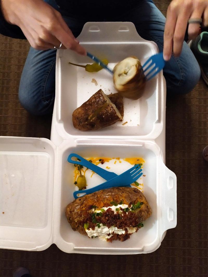 On redescend des hauteurs et la neige disparait, puis on arrive à Boise et on trouve notre hotel. Installés, on se remet en route et on va à la recherche de notre loaded potato ! Nous ne quitterons pas l’état de la patate sans en avoir gouté une. On demande conseil et on nous guide vers le Westdrive-in, un drive-in vraiment stylé à l’ancienne avec de beaux néons roses. Ce sera parfait ! On commande une Basic Idaho (beurre et sel) et une « The Work » (crème sûre, cheddar, bacon) qu’on retourne manger à notre chambre d’hôtel… On peut le confirmer maintenant : cette spécialité locale est délicieuse !