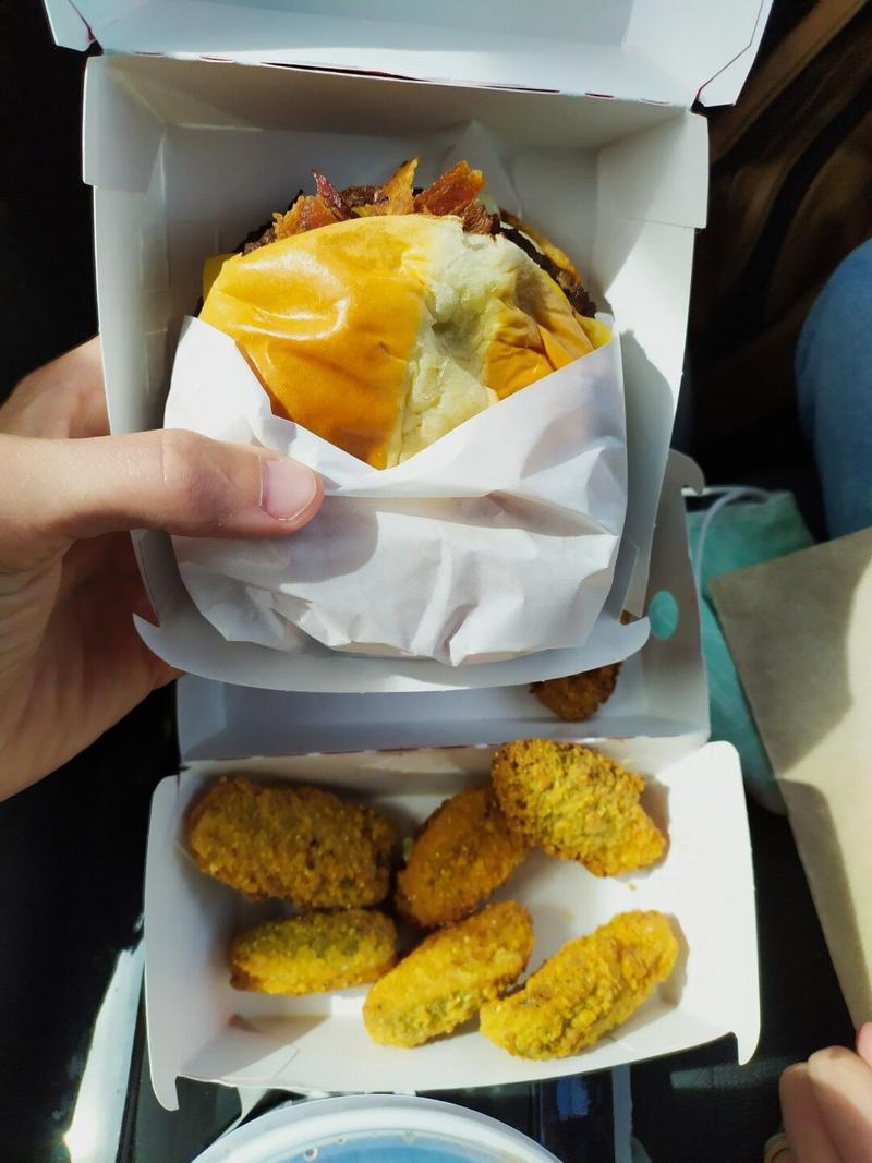 On s’arrête à un Jack in the Box pour un burger et des sortes de boulettes de fromage au jalapeños : c’est bon, mais ça arrache vraiment trop ! 🔥