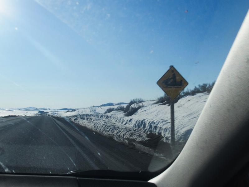 La route continue et alterne entre paysages enneigés et dégelés, mais elle a été complètement dégagée et ne pose pas de souci. On passe par le 45e parallèle, célébré par un panneau qui indique que nous sommes exactement à équidistance entre l’équateur et le pôle nord.
