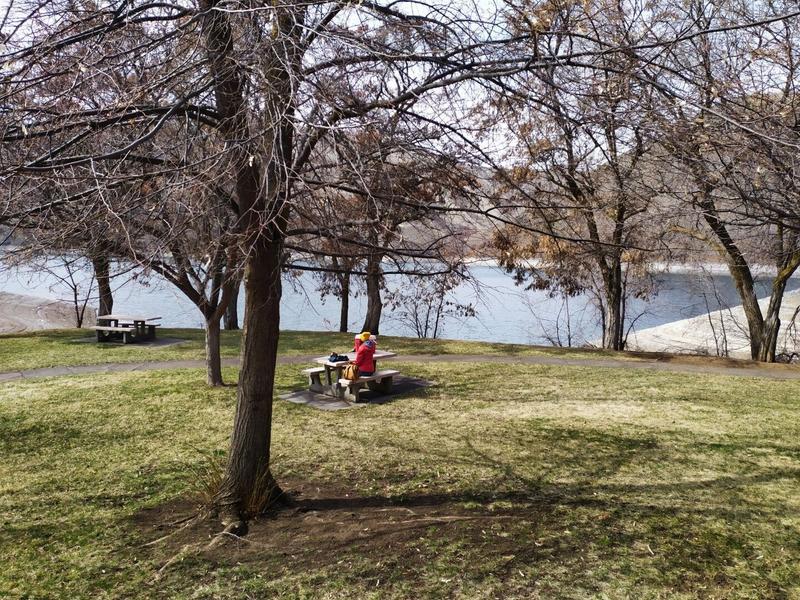 On s’arrête sur une petite aire de repos qui surplombe le cours d’eau pour manger, notemment l’un des bagels reçus ce matin.