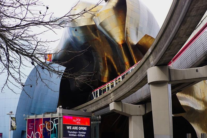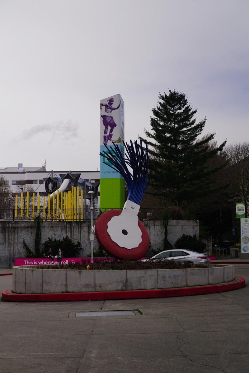 On commence par le point le plus proche et le plus facile pour se diriger : la fameuse Space Needle, cette tour à la forme si particulière qui lui donne une skyline si reconnaissable. La tour est grande et impressionnante mais serait plus petite que la Tour Eiffel. Difficile à imaginer aux pieds de celle-ci ! On retrouve, du côté de la tour, cette sculpture qu’on avait également trouvée à Las Vegas, c’est marrant ! On y trouve aussi le musée de la Pop Culture, au design très coloré. Un monorail passe au travers du bâtiment et de la musique est diffusée constamment, plutôt cool !
