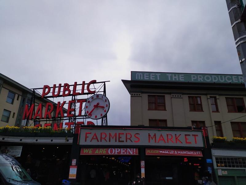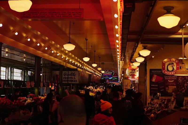 En face, il y a le Pike Place Farmers Market, sorte de dédale de petites échoppes réparties sur plusieurs étages, demi-étages, petits couloirs cachés et culs-de-sac. Les échoppes vendent de tout : du poisson bien sûr, mais aussi toutes sortes d’autres nourritures, du vin, des bières, des souvenirs, des livres, et il y avait même un étrange magasin de magie. Sans être bondé, ce petit marché grouillait de vie dans tous les sens, impossible d’en faire le tour complet sans se perdre.