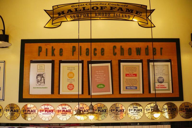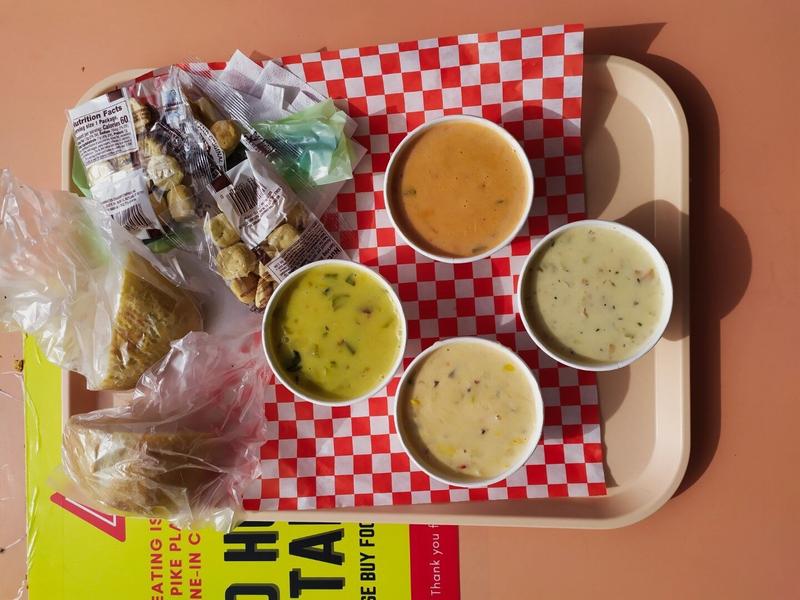 Tout ceci nous a donné bien faim et nous quittons le marché et nous éloignons de la Pike Place pour entrer dans la toute petite Post Alley, toute proche. On y trouve toutes sortes de restaurants, mais surtout le Pike Place Chowder qui, comme son nom l’indique, vend des Clam Chowders réputés pour être les meilleurs de la ville. Ils proposent un plateau de dégustation avec 4 choix, ce que nous prenons : New England Clam Chowder, Smoked Salmon Chowder, Lime & Coconut Chowder et Market Chowder (celui du jour). C’est bon, c’est chaud et ça remplit bien ! 😊