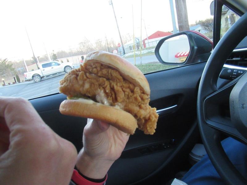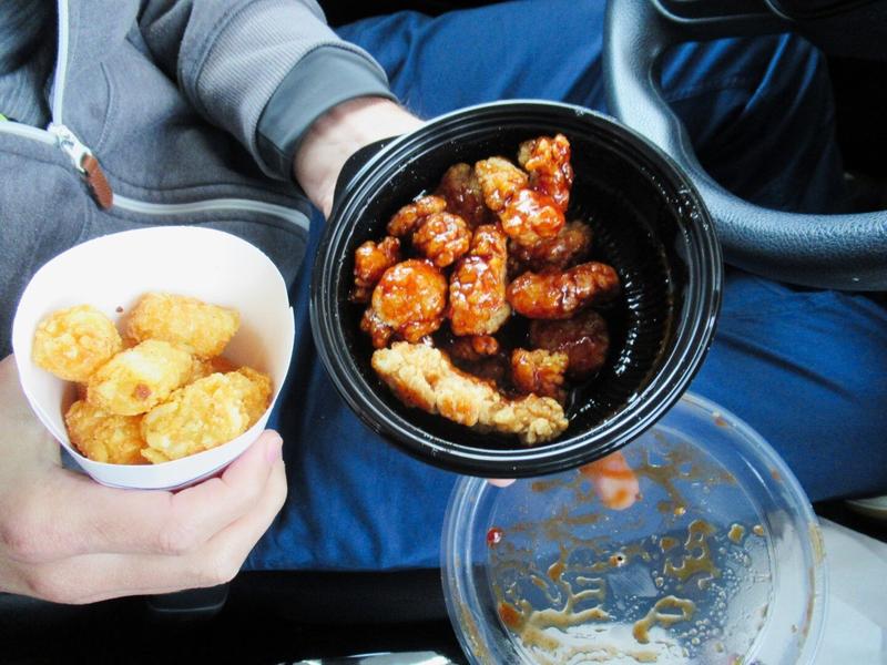 La partie musée est fermée (COVID toujours), mais nous craquons pour un petit burger de poulet et des frites que nous mangeons sur le parking de là où tout a commencé : excellent ! 🍟
