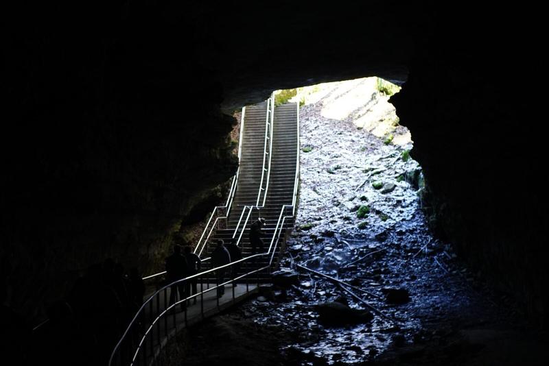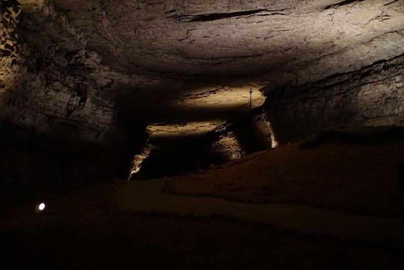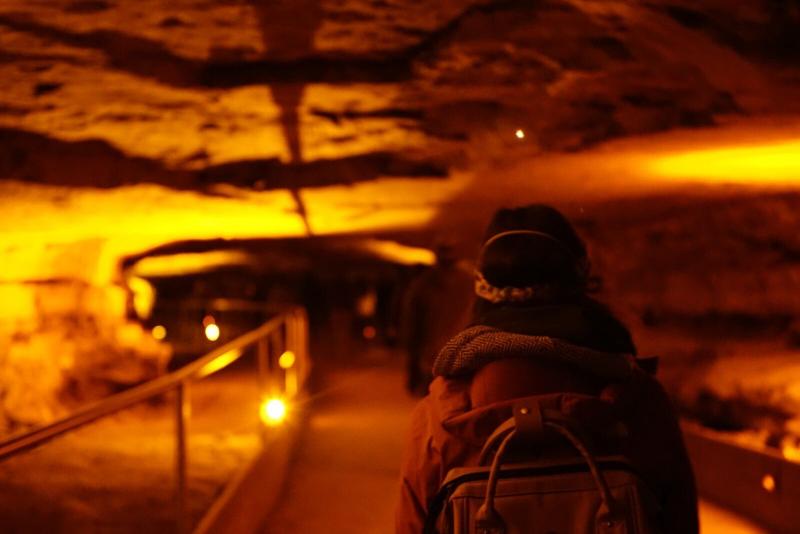 Après avoir foulé les sentiers en surface hier, nous descendons dans la grotte ! L’organisation est différente avec les mesures de sécurité mises en place, nous avons donc pris un tour guidé. Celui-ci nous emmène dans les profondeurs de cette grotte immense (où il fait plus chaud qu’à l’extérieur) et nous explique l’importance de celle-ci dans l’histoire américaine (la pierre utilisée pour la poudre de canon), ainsi que sa singularité. Il s’agit d’une grotte sèche et donc sans stalactites ni stalagmites grâce à la roche étanche composant son toit.