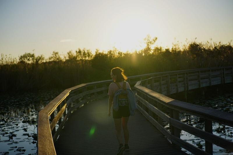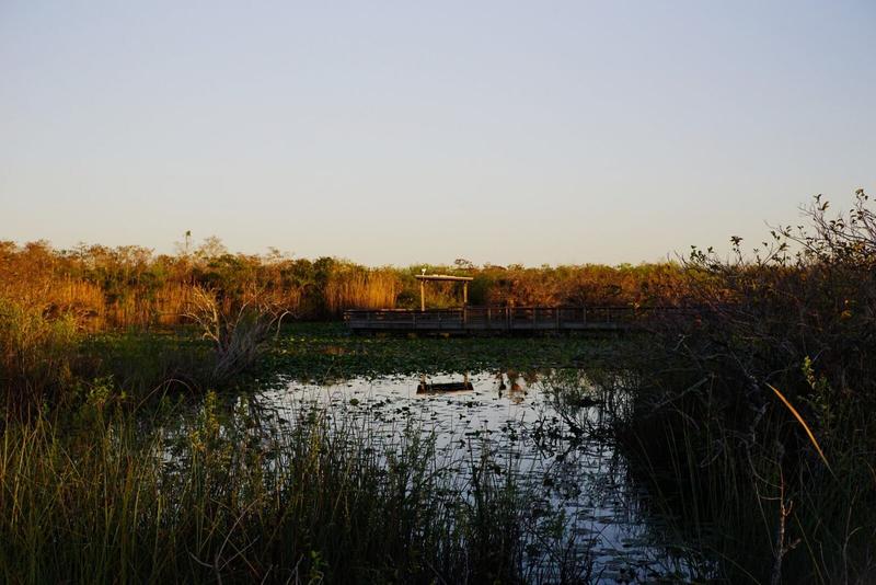 Arrivés au bout de la route, nous retournons du côté du Parc National des Everglades pour emprunter le sentier d’Anhinga Trail au soleil couchant. Des personnes nous montrent un bébé alligator qui est caché dans l’eau (que nous mettons un temps fou à repérer, mais heureusement ils sont patients) puis un alligator qui n’a plus rien d’un bébé sur le bord de la route (heureusement, celui-là, nous le repérons directement). La suite du chemin continue sur les caillebotis et permet d’observer les marais, les oiseaux et poissons qui y vivent avec parfois des bruits assez surprenants et pas toujours rassurants.