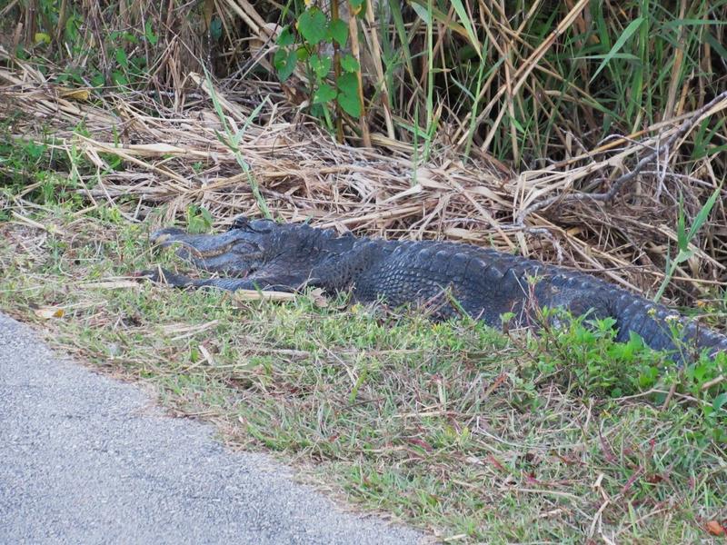 Ce matin, nous retournons dans le Parc National des Everglades, mais via l’autre entrée : direction le Shark Valley Visitor Center. Depuis cet endroit, une longue boucle permet de longer des marais et observer de nombreux alligators. C’est assez flippant et très impressionnant. Heureusement, ils restent immobiles et on peut continuer notre chemin sans se faire poursuivre. On repère également de nombreux oiseaux et même un petit bébé alligator : à cette taille-là, c’est encore mignon. On ne fait pas la boucle complète, elle est très longue et plutôt réservée aux vélos – surtout par cette chaleur et on revient sur nos pas.