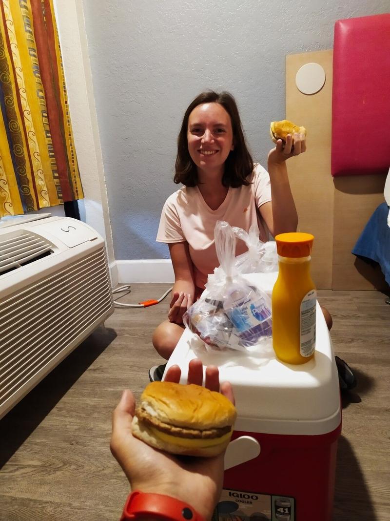 On se réveille après avoir bien dormi ! Après une bonne douche qui termine de nous réveiller, on se dirige vers le petit-déjeuner. À cause du COVID (on vous a déjà un peu parlé de lui, non ?! 😊), il est distribué dans un sac et doit être mangé dans la chambre. Au menu : un burger (on ne s’y attendait pas, c’est trop bien !), un yaourt, un muffin à la myrtille et de l’eau. Puisqu’il n’y a pas de table, on mange par terre sur la glacière.
