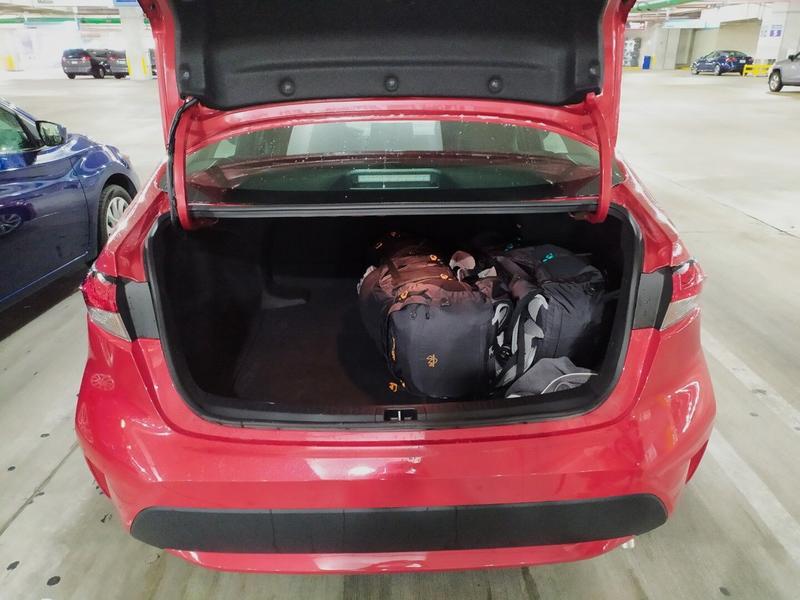 Nous prenons de quoi manger ainsi qu’une glacière qui nous permettra de conserver des aliments au frais pendant nos journées de route, et donc d’éviter de devoir acheter chaque fois des snacks ou autre sur la route. Nous avions déjà fait comme ainsi lors de notre premier roadtrip en Californie et cela avait bien marché. Souvent les motels ont un distributeur gratuit de glace, ce qui permet de maintenir les aliments au frais. La glacière rentre sans aucun problème dans le coffre à côté des sacs et il reste encore de la place !
