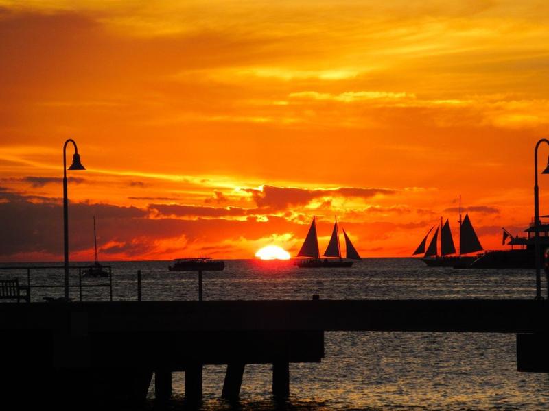 Avec tout ça, nous nous dirigeons vers Malory Square d’où nous regardons le soleil se coucher : Key West est réputé pour offrir les plus beaux couchers de soleil des USA. Nous n’avions rien vu, dû à la météo, 2 ans plus tôt. Cette fois-ci il tient ses promesses !