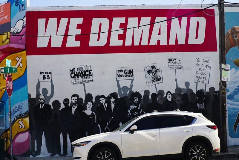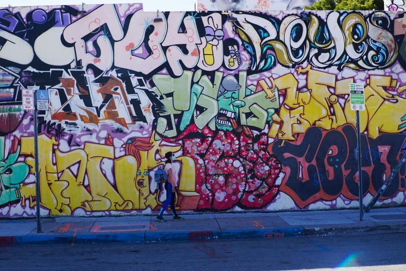 Première étape : le fameux quartier Wynwood ! Les 2 bus que nous devons prendre s’enchaînent bien et nous y arrivons assez vite. Ce quartier est le cœur du street art à Miami et s’étend sur plusieurs blocs, présentant ainsi des kilomètres de murs remplis de fresques toutes plus belles les unes que les autres. Il est difficile de trouver un mur gris ici, et s’il n’y a plus de place au mur, le sol prend le relais couvert de tags, de collages, de messages. Les poteaux sont également souvent peints ou recouverts de stickers.