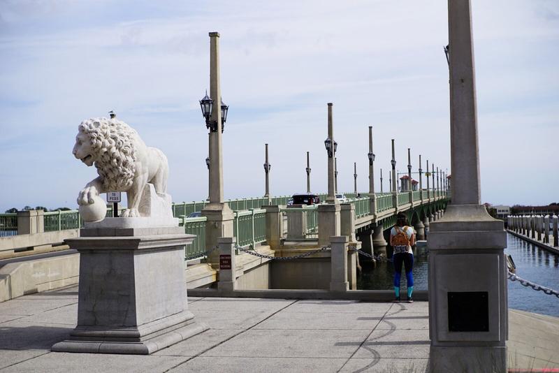 On se met en route pour visiter la petite ville de Saint Augustine. Il s’agit de la ville considérée comme la plus vieille des États-Unis et lieu d’accostage de la première exploration espagnole. Du coup, on y retrouve un style « vieilles pierres » (rare aux USA) et une architecture coloniale espagnole mêlée à du classique américain, c’est plutôt sympa et très agréable à visiter. L’endroit est assez touristique mais vaut vraiment le détour. On y retrouve une rue principale bordée de magasins, de restaurants dans de beaux bâtiments et un petit parc abritant des écureuils mi-curieux, mi-craintifs. La rue débouche sur les portes de la ville et sur le fort « Castillo de San Marcos ». Il se situe au bord de la rivière Matanzas enjambée par le « Bridge of Lions ». La ville est vraiment belle et ce qu’on aime surtout, c’est trouver des petites rues moins fréquentées, plus calmes et tout aussi belles, bordées de jolies maisons.