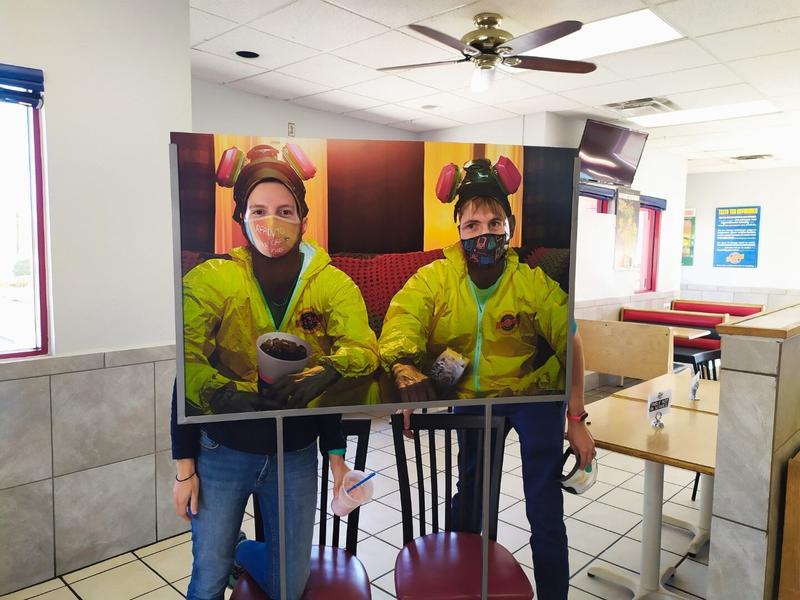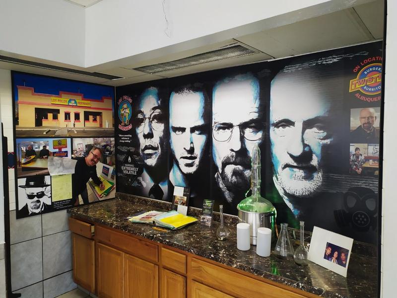 On termine notre visite par le fameux restaurant Los Pollos Hermanos ou plutôt Twisters dans la vraie vie qui est bien un restaurant. On y rentre et il y a plein d’éléments qui se rapportent à la série : un dessin du logo de Los Pollos Hemanos est resté sur le mur, des photos et signature des acteurs et de l’équipe de tournage, un décor pour se mettre dans la peau des personnages pour faire une photo… Ils ne vendent pas de poulet, comme dans la série mais font plutôt des burritos. On trouve quand même un burger de poulet, accompagné d’un milkshake banane-fraise… et c’est l’un des meilleurs burgers qu’on ait mangé jusqu’ici !