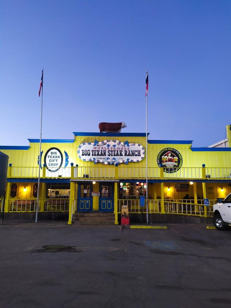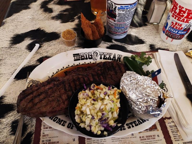 On arrive à notre motel où nous dormirons les 2 prochaines nuits et on se met en route vers LE restaurant du coin à ne pas manquer qui est partout dans les dépliants, sur les panneaux le long de la route et sur le net : The Big Texan Steak Ranch. Comme le nom l’indique, ici on mange surtout du steak et, fidèle à la tradition américaine – encore plus forte dans l’état du Texas – plus c’est énorme meilleur c’est ! Il y a d’ailleurs ici un concours dans lequel le steak t’est offert si tu arrives au bout (comprenant aussi les accompagnements) … et cette pièce de boeuf fait 72oz soit un peu plus de 2kg ! On la joue beaucoup plus soft et on s’en prend un « petit » de 500 grammes pour deux, avec une patate douce, du coleslaw, trois crevettes (on ne comprend pas trop pourquoi, mais ça va avec apparemment) et une boisson chacun. Même si c’est e portion pour une personne, c’est déjà bien assez pour nous ! Après plus d’un mois dans le pays, nos estomacs ne sont pas encore prêts pour des vraies quantités américaines. L’endroit est vraiment sympa, il y a des chapeaux et des bottes de cowboys partout, c’est une expérience délicieuse !