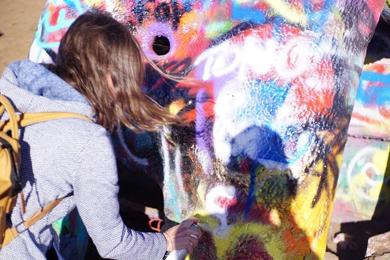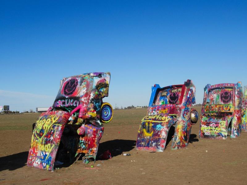 Premier arrêt à l’est de la ville, au Cadillac Ranch. Il s’agit d’une roadside attraction, qui est une œuvre d’art au milieu d’un champ. Elle prend la forme de 10 Cadillac enterrées par le nez et est située le long de l’ancienne Route 66. La créativité et la participation y sont encouragées… Si bien qu’on ne voit presque plus ce qu’il y a sous la couche épaisse de peinture. Ces 10 Cadillac représentent l’évolution de la gamme entre 1949 et 1963 et sont dans un sale état, mais il faut avouer que le lieu est assez fun et fréquenté ! Alors, on ne résiste pas à prendre l’une des bombes de peinture laissée là par des artistes en herbe et on rajoute une petite couche de couleur par-dessus les autres !