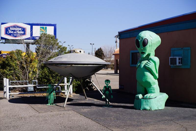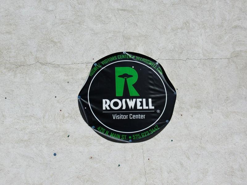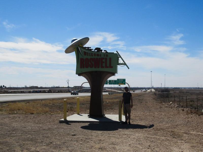On quitte ce parc où nous pensions passer rapidement alors que le soleil baisse doucement et nous continuons notre route vers Roswell. Après un arrêt à une pompe à essence pour une envie pressante et la dégustation d’une « sausage on a stick » aux jalapeños, nous arrivons à Roswell. Cette ville est connue pour l’écrasement, selon les versions, d’un ballon ou d’un OVNI. La ville surfe à fond là-dessus et il y a des petits bonshommes verts cachés un peu partout.
