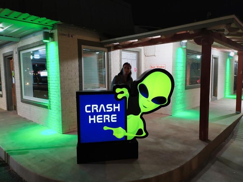 On arrive à notre motel, qui n’est pas en reste au niveau de la déco dans le thème et à notre chambre. Elle se situe à côté d’un hôpital qui a son propre hélicoptère (c’est bien un objet volant identifié celui-ci), c’est pas le plus silencieux mais c’est original ! 😊