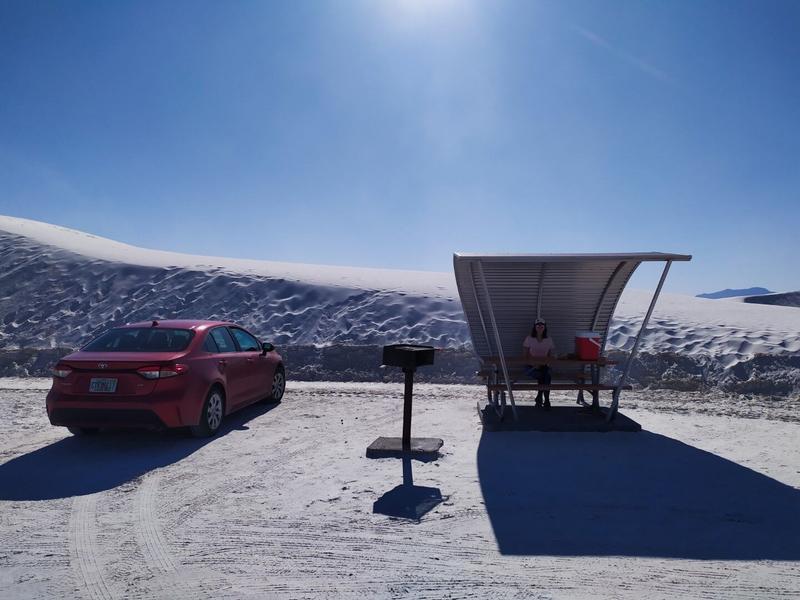 On s’arrête pour manger dans l’une des picnic area, encore une fois très bien pensée, puis on s’essaie à la glisse sur les dunes… à l’aide d’un sac plastique. Ça semble moins efficace que les petites soucoupes qu’ils vendent au Visitor Center, mais on se marre bien !