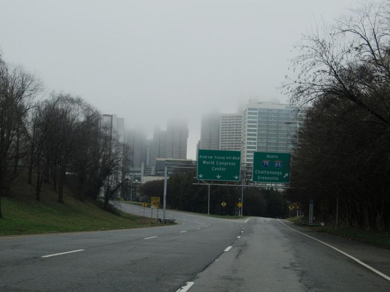 Après un petit-déj bien chargé (on a encore de quoi manger pour les deux prochains jours), on replie les bagages et on se met en route vers Atlanta et plus précisément le World of Coca-Cola, dans le centre-ville. En s’approchant de la ville, on voit le haut des bâtiments disparaitre dans la brume. Il fait un peu moins froid aujourd’hui, mais la pluie est bien là.