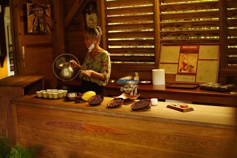 Ces explications sont très intéressantes parce qu’en général, on a l’occasion de visiter une chocolaterie, qui nous raconte comment arriver au produit final depuis les palets de chocolat, mais ici cela porte plutôt sur toute l’évolution depuis la cabosse jusqu’au palet de chocolat. La dégustation suit le même chemin et nous avons pu goûter la fève de cacao, fraiche et sortie de la cabosse, jusqu’à différentes sortes de chocolats en passant par la fève de cacao torréfiée puis broyée et enfin la boisson chocolatée typique. La visite continue par une balade dans la cacaoyère qui est très belle et dans laquelle un chemin pédagogique nous en apprend encore plus sur le cacao. Et nous terminons bien sûr par un petit passage à la boutique où nous avons acheté du chocolat noir au sucre de canne… Un délice !