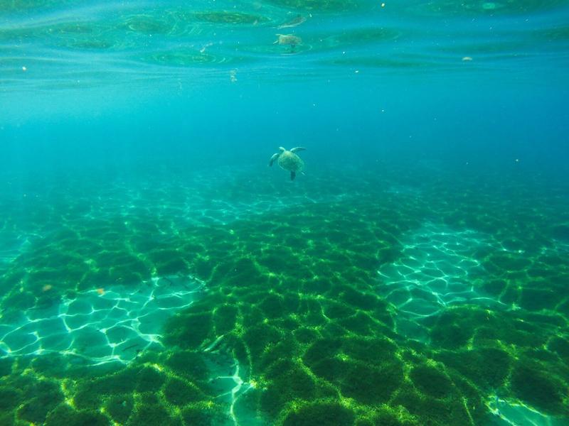 Nous voici repartis en direction de la plage de Malendure, et heureusement il y a beaucoup moins de monde en ce lundi matin. La veille, nous avions dû abandonner l’idée d’y snorkeler. Nous nous mettons à l’eau directement afin de retrouver une tortue mais nous tombons surtout sur des petites méduses difficiles à voir et à éviter. Elles nous piquent un peu (pas très agréable sur le moment et un peu flippant quand même) mais nous finissons par voir à nouveau une tortue plus ou moins au même endroit que la dernière fois ! Nous sommes seuls avec elle un moment, puis nous nageons pour revenir sur la plage et sécher un peu. A peine sortis de l’eau, on remarque un barracuda qui a l’air de faire plus d’un mètre et qui nage très près du rivage. On est contents de l’avoir vu en étant hors de l’eau celui-là, sous l’eau, où tout semble encore plus grand, il doit être particulièrement intimidant !