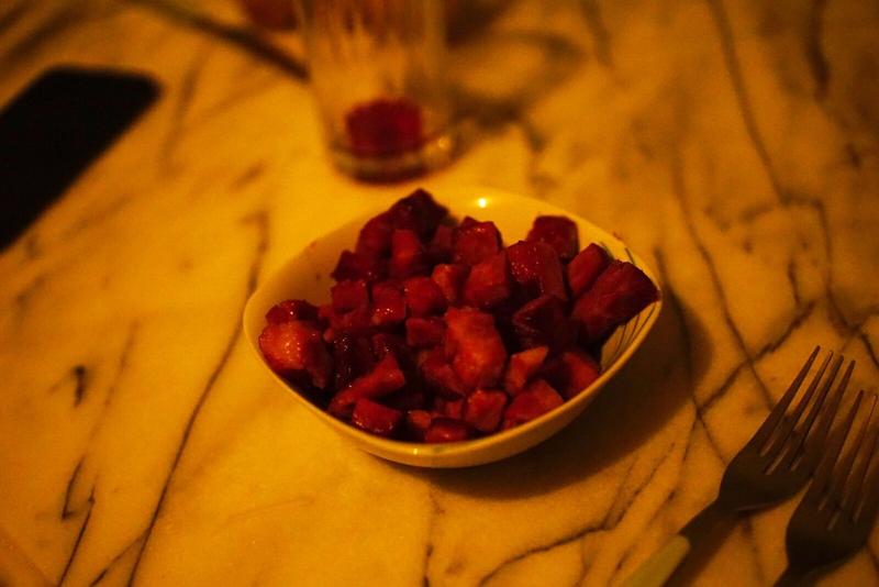 Pour le souper de réveillon, nous avons prévu un repas le plus local et traditionnel possible : chips de bananes et dés de jambons caramélisés au sucre de canne et pétillant de Gwozey (groseilles) pour l’apéro, suivi d’un jambon « Chanté Nwel » et un gratin de giraumon.