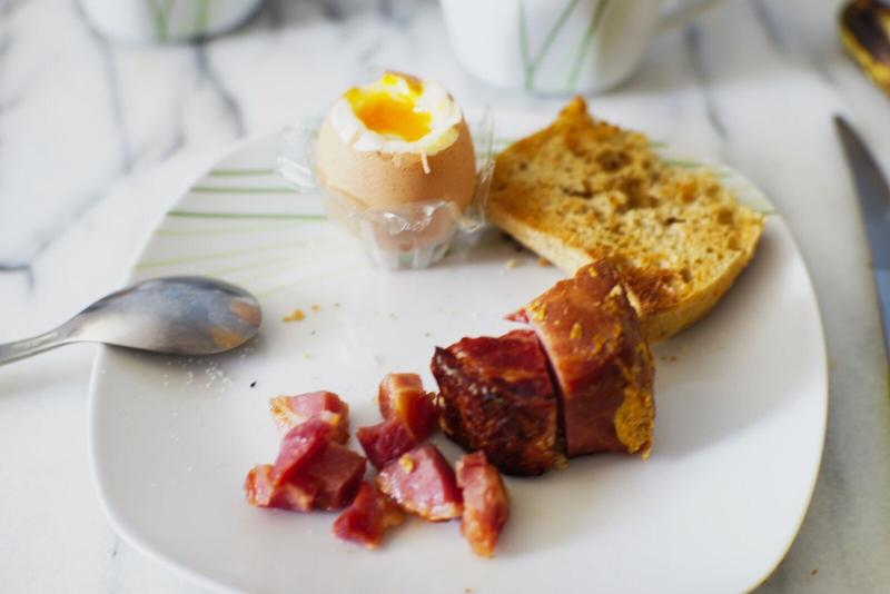On débute la journée avec un petit brunch de Noël à base d’œufs, jambon (il nous en reste pour quelques repas encore) et toasts au piment grillés. Encore une fois, il faut ruser parce qu’on n’a pas tout ce qu’on aimerait sous la main : les coquetiers sont découpés dans la boite à œufs avec la paire de ciseau de couture 😊