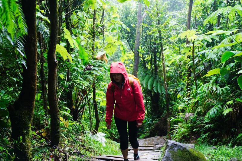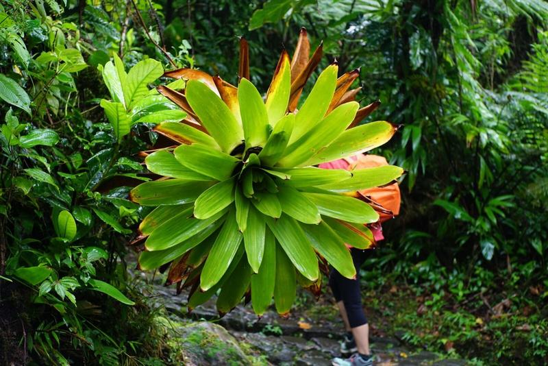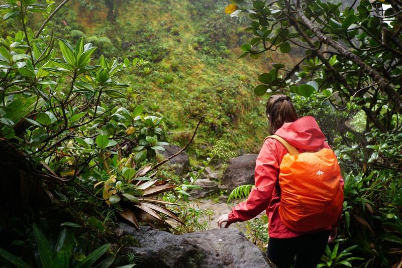Arrivés au point de départ, la météo confirme notre présentiment tout au long de la route : la randonnée se fera sous un ciel gris, très nuageux et parfois un peu pluvieux. Plus haut sur le chemin, on entendra un guide dire que le ciel est dégagé à peu près 10 jours par an ici et que la météo change très vite. Tout cela est dû au fait qu’il s’agisse d’un volcan, encore en activité au milieu d’une île tropicale, qui condense et accroche tous les nuages des environs. Nous étions préparés à cela, on enfile nos K-Way et c’est parti pour cette randonnée de plus de 560m de dénivelé sur 7km de distance !