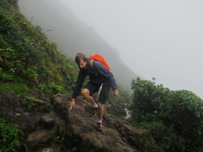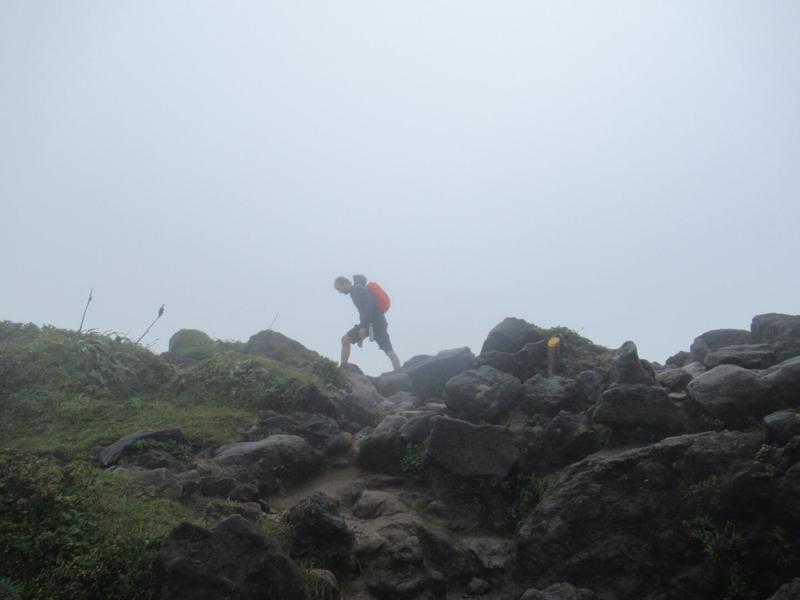 Arrivés à un parking, ancien point de départ pour la randonnée, nous commençons le vrai challenge : ici, il n’est plus question de pavés mais d’un vrai chemin de montagne. Nous continuons à grimper le chemin, passant par des sentiers de cailloux, des rochers à grimper, des marches plus ou moins bien conservées, des moments de pluies, de vents. La montée est rude (après tout, le sentier est noté comme « difficile ») mais nous ne lâchons rien !