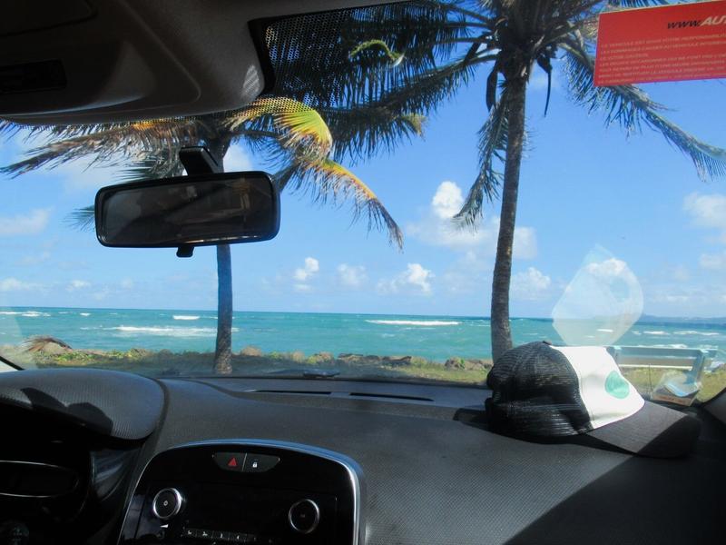 Après avoir parcouru le grand Nord-Est hier, nous nous mettons en route vers le Sud-Ouest. Nous rejoignons la plage de Grande Anse des Anses d’Arlet. On voit directement que l’endroit est plus touristique et plus habité que le nord, les voitures sont plus nombreuses et aux abords directs de la plage, la circulation est très compliquée. Nous trouvons malgré tout une petite place pour notre voiture promotionnelle dans une sorte de terrain vague, près d’autres voitures.