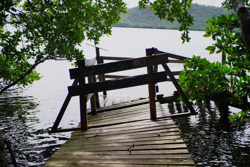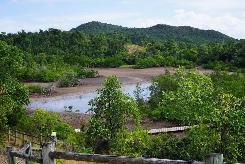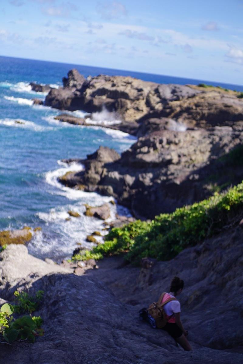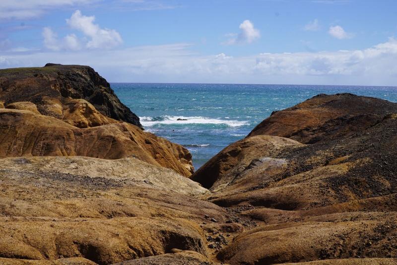 Après avoir passé les ruines du château, nous commençons réellement la randonnée et descendons l’escalier qui s’enfonce dans la mangrove. La balade est certes longue, avec quelques passages plus techniques où il faut être attentifs mais elle est surtout très belle et traverse des paysages très variés : nous sommes passés de la mangrove, avec ses caillebotis et ses palétuviers, à des plaines plus arides et leurs chemins de terre de couleurs étonnantes, en passant par des sous-bois remplis de crabes et de bernard-l’ermite. Le sentier longe aussi en grande partie la côte et offre des vues à couper le souffle sur l’océan atlantique, les falaises et des points de vue sur la presqu’île. Certains sentiers demandent d’escalader des rochers et donnent l’impression d’être seuls au bout du monde. Nous avons croisé pas mal de randonneurs en début du chemin (surtout sur le sentier commun avec la plus petite boucle) puis de moins en moins jusqu’à ne croiser que quelques petits groupes qui venaient en sens inverse (on a un peu eu l’impression d’être les seuls à l’avoir parcouru dans ce sens-là).