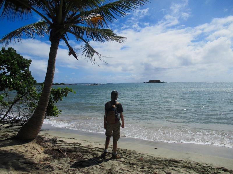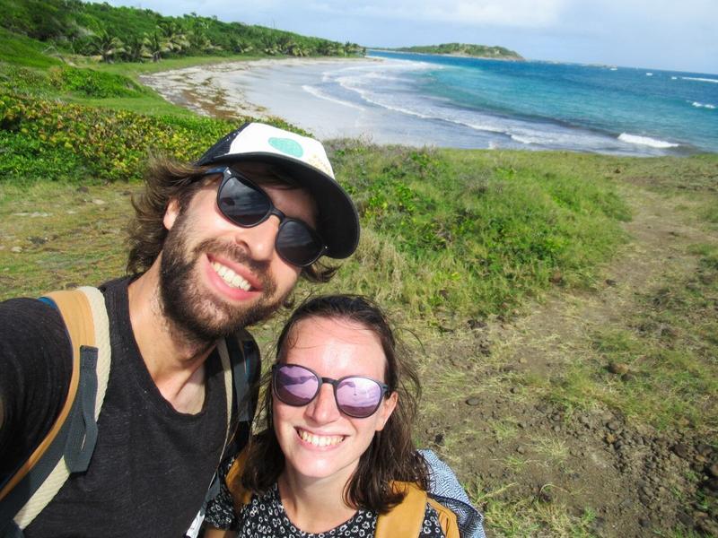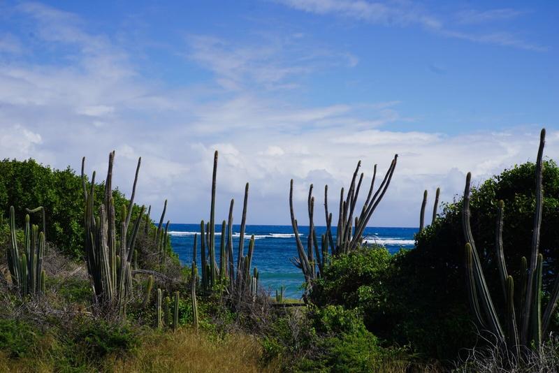 Nous continuons cette randonnée qui traverse tour à tour une étendue aride, des plaines d’herbes et de cactus, des petits sous-bois ou des bois et toujours en longeant la mer, tantôt à flanc de falaise, tantôt au niveau de l’eau avec des petites plages désertes. Après 4km de marche assez simple, mais sous le soleil, nous arrivons à destination : la plage de la Anse Trabaud – très longue, au sable blanc (même si quelques sargasses viennent jouer les trouble-fêtes) et vraiment déserte par endroit. Le vent balaye la plage assez fortement, mais nous trouvons un endroit quelque peu protégé pour profiter du lieu et manger face à la mer des caraïbes. Puis, il s’est mis à pleuvoir. Heureusement pas trop longtemps. On a bien cru devoir terminer sous la drache.